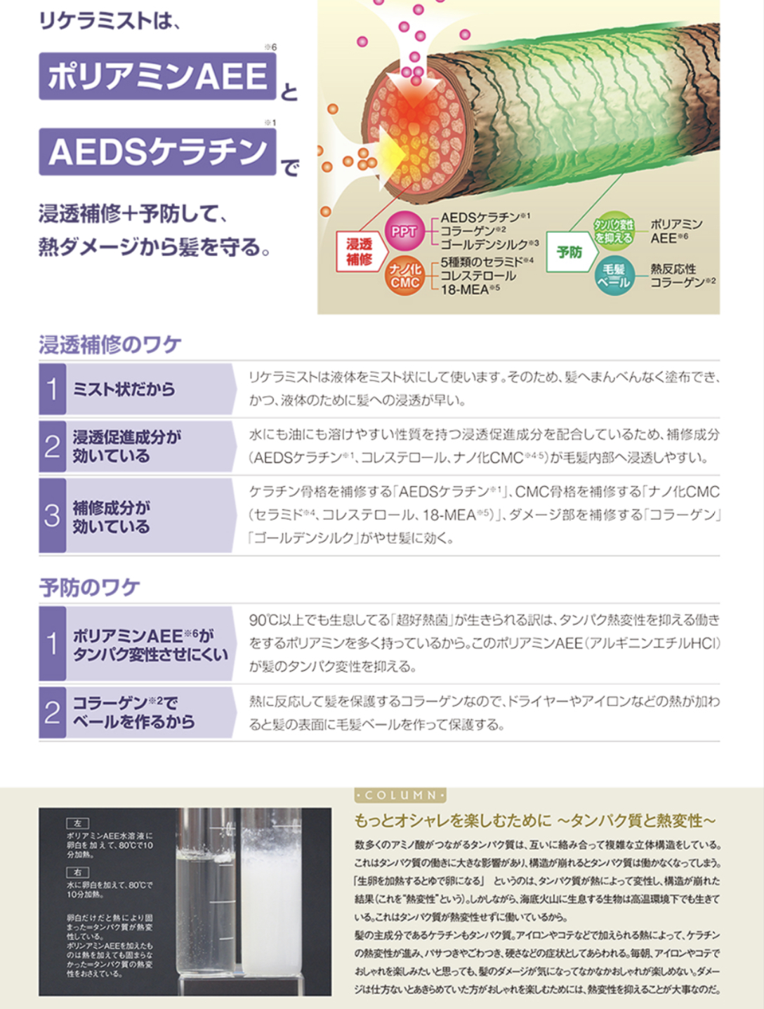 | 備考: | 「こんな方におススメ」 毎朝、コテやアイロンを使う人 ダメージは少ないけど、やわらかい髪の人 エイジング毛で、さらにダメージした髪 「仕上がり」 さらさらで、しなやかな髪 「香り」 瑞々しいネクタリン、ピーチと甘酸っぱいベリーにフローラルブーケとハチミツの香りが溶け合うフルーティフローラルの香り 「効果的な使い方」 乾いた髪全体にプッシュ。 毛先がパサつくときは、毛先に集中的につけて乾かすとGood! |